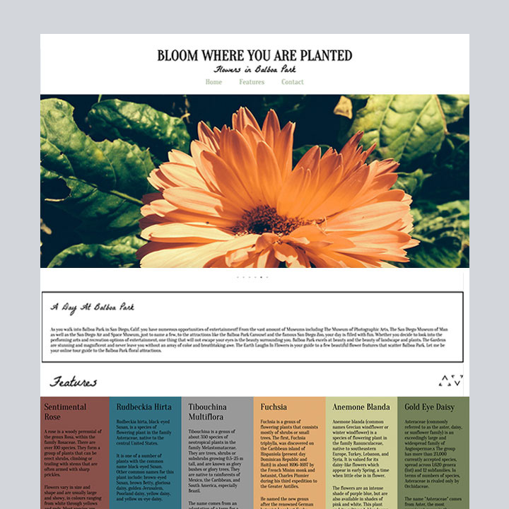As a class project, we were told to make an informational site about anything we would like. I decided to make mine about the types of flowers in Balboa Park, San Diego. It was a great learning experience to be able to create a fun site where I had full creative license.